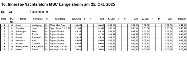 Wir haben die Startnummer 76 bekommen, das ist zugleich die letzte Startnummer in der Liste. Was gleichzeitig bedeutet, dass wir mit dem leistungsschwächsten Fahrzeug dabei sind. Nicht alle Prüfungen darf man vorher komplett abfahren, von daher ist es für uns als Köln-Ahrweiler-Neuling eine gewisse Herausforderung. Wir hoffen, dass der Wagen hält, wir würden schon gerne bis zum Ende der Rallye dabei sein. Informationen findet man unter rallye-koeln-ahrweiler.info, Zeiten werden auf der gleichen Seite unter rallye-koeln-ahrweiler.info/live-ergebnisse zu finden sein. Ich denke, diese könnten auch bei ewrc-results.com veröffentlicht werden. Bitte drückt uns die Daumen. 26.10.2025 - Innerste-Nachtslalom MSC Langelsheim Felix mit Gaststart in der 2a Beim Nachtslalom war Felix bereits vor ein paar Jahren am Start. Das hatte ihm gut gefallen und so wollte er gerne am gestrigen Samstag nochmal mitfahren. Da Felix über die Woche in seiner Braunschweiger Wohnung war und der Aufwand gering sein sollte, wollte er mit seinem privaten Seat Ibiza ins relativ nahe Oschersleben fahren und mit dem silbernen Spanier in der 2a starten. Kurzfristig ergab sich aber die Möglichkeit, in den bekannten roten Toyota Starlet von Daniel Brusch als Fahrer Nummer 5 zu steigen. Der Wagen ist deutlich geeigneter als Felix' Seat. 1000x Danke an Daniel. Es hat Felix viel Spaß gemacht, den Toyota zu fahren und auch sportlich konnte es sich sehen lassen. Platz 3 und somit ein weiterer schöner Pokal für Felix. ![]() 13.10.2025 - Grönegau-Slalom AC Melle / AMC Hoyel Tolles Saisonfinale auf dem Segelflugplatz Melle/Gerden Ach, was war der gestrige Sonntag doch herrlich. Der Slalom-Klassiker lockte wieder einmal zahlreiche Motorsportler an. Üppige 76 Teilnehmerinnen und Teilnehmer waren es in den Klassen 1a bis 3b, stolze 12 Fahrer rauften sich in der GLP. Diverse Gaststarter aus OWL brachten teils tolle und leistungsstarke Autos mit, den Anwesenden wurde so einiges geboten. Diesmal hatten wir den VW Polo mitgebracht. Das Fahrwerk taugt hier besser, zudem sind die Slicks des Renault Clio ziemlich tot. In den Probeläufen der beiden direkt hintereinander gestarteten Veranstaltungen fühlte ich mich im Auto sofort wohl. Gleich zu Beginn des ersten Wertungslaufes des Meller Slalom hatte ich beim Aufbiegen auf die linke Seite des Flugplatzes allerdings einen Fehler drin. So passte die Linie für die Zufahrt zur schräg stehenden Gasse nicht mehr. Aber egal, das Fahren machte trotzdem Spaß. Der enge und etwas hakelige Parcours liegt Felix. Er konnte hier unter 14 Teilnehmern in der Klasse 3b Platz 2 einfahren, ich immerhin Platz 9. Glückwunsch an Felix für die tolle Leistung. Unter 76 Teilnehmern im Gesamt war das für ihn Platz 7. Das kann sich sehen lassen.
